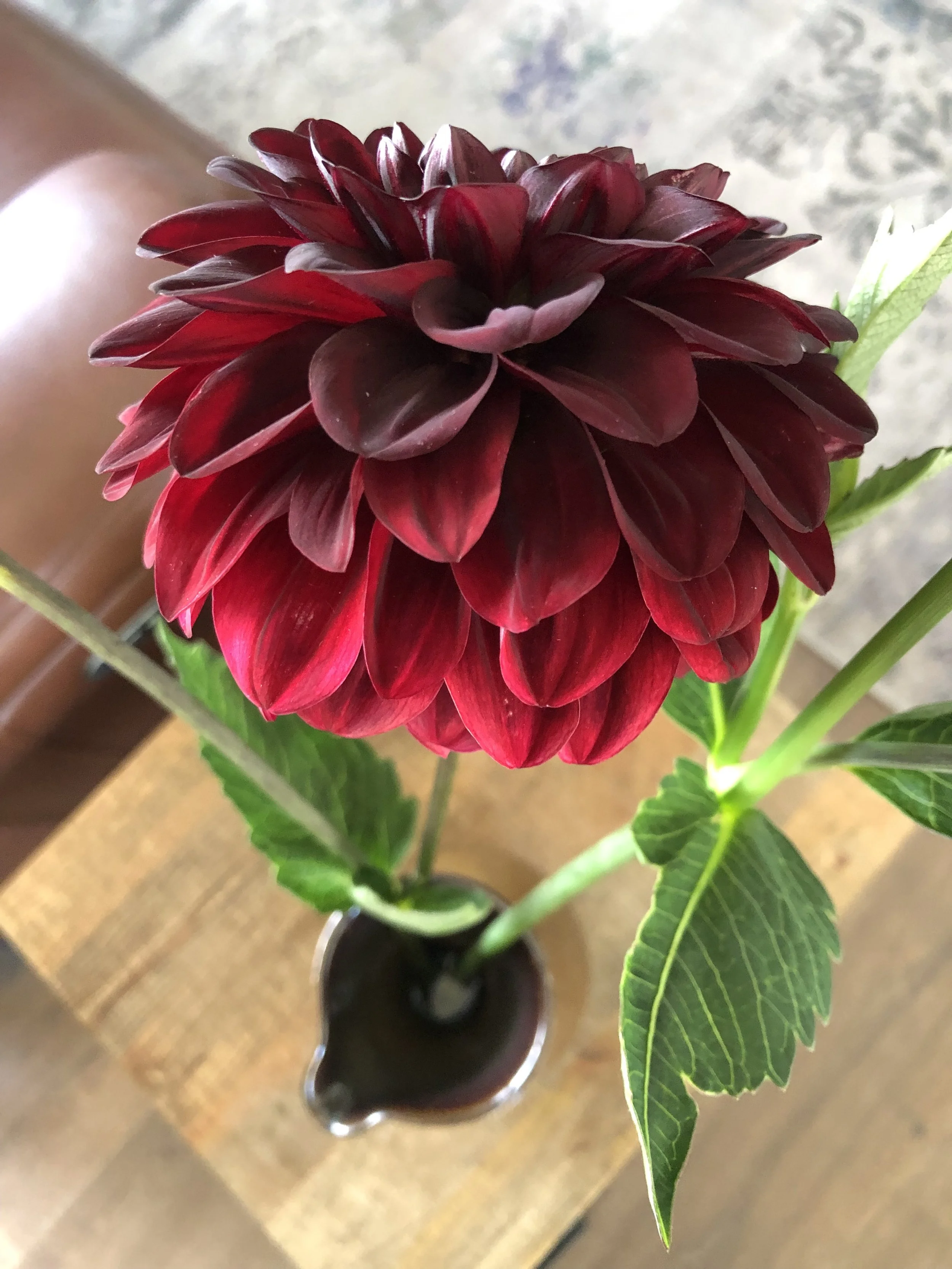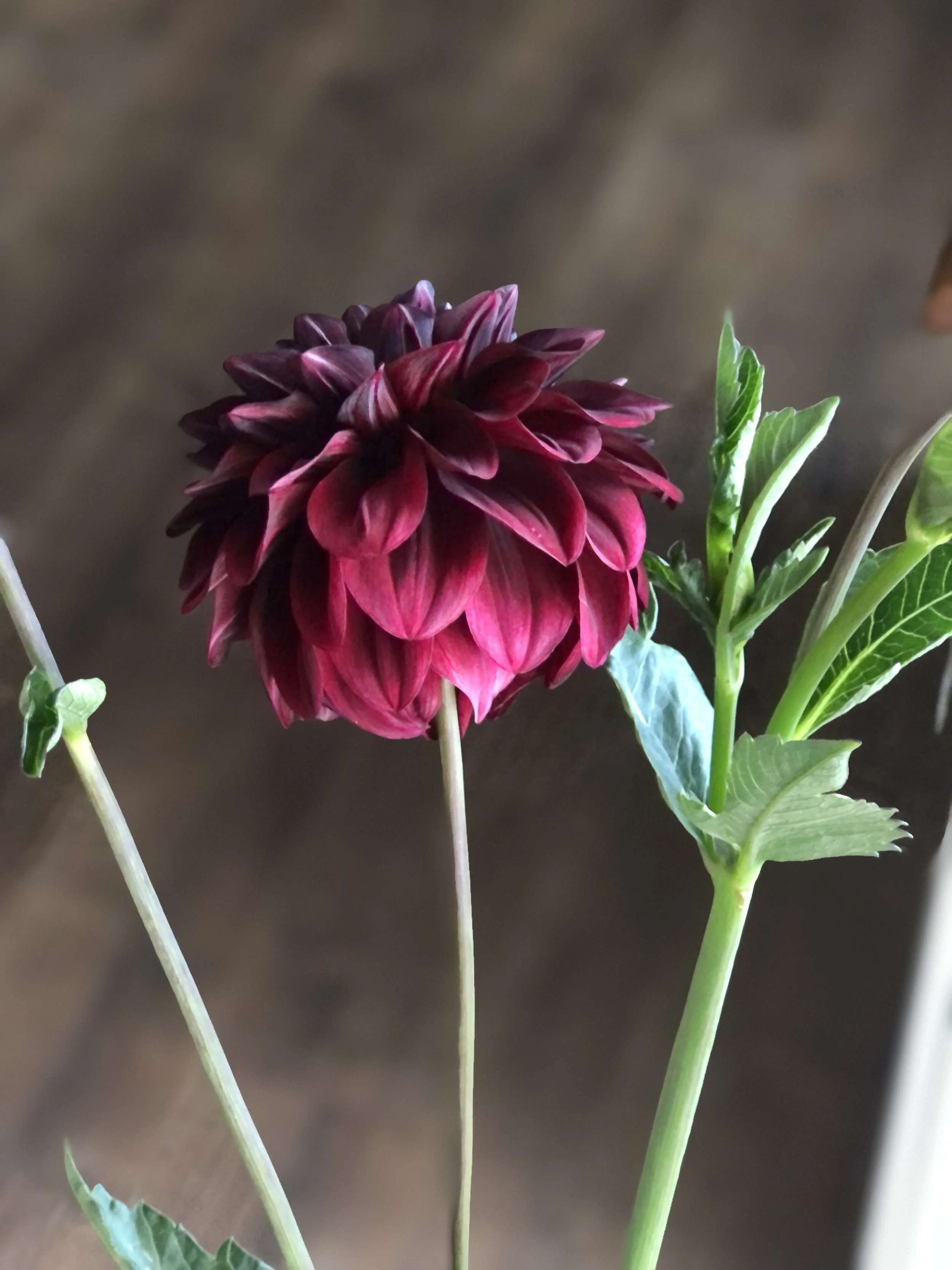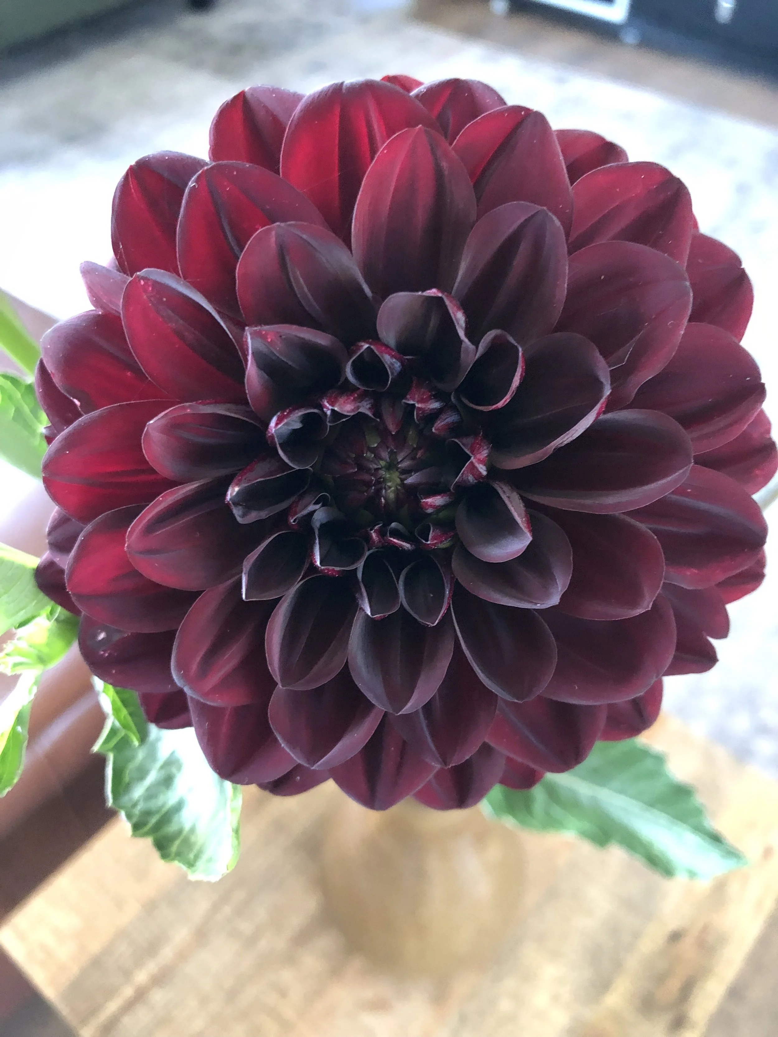 A formal decorative dahlia with rich wine tones, so deep they appear almost burgundy-black.