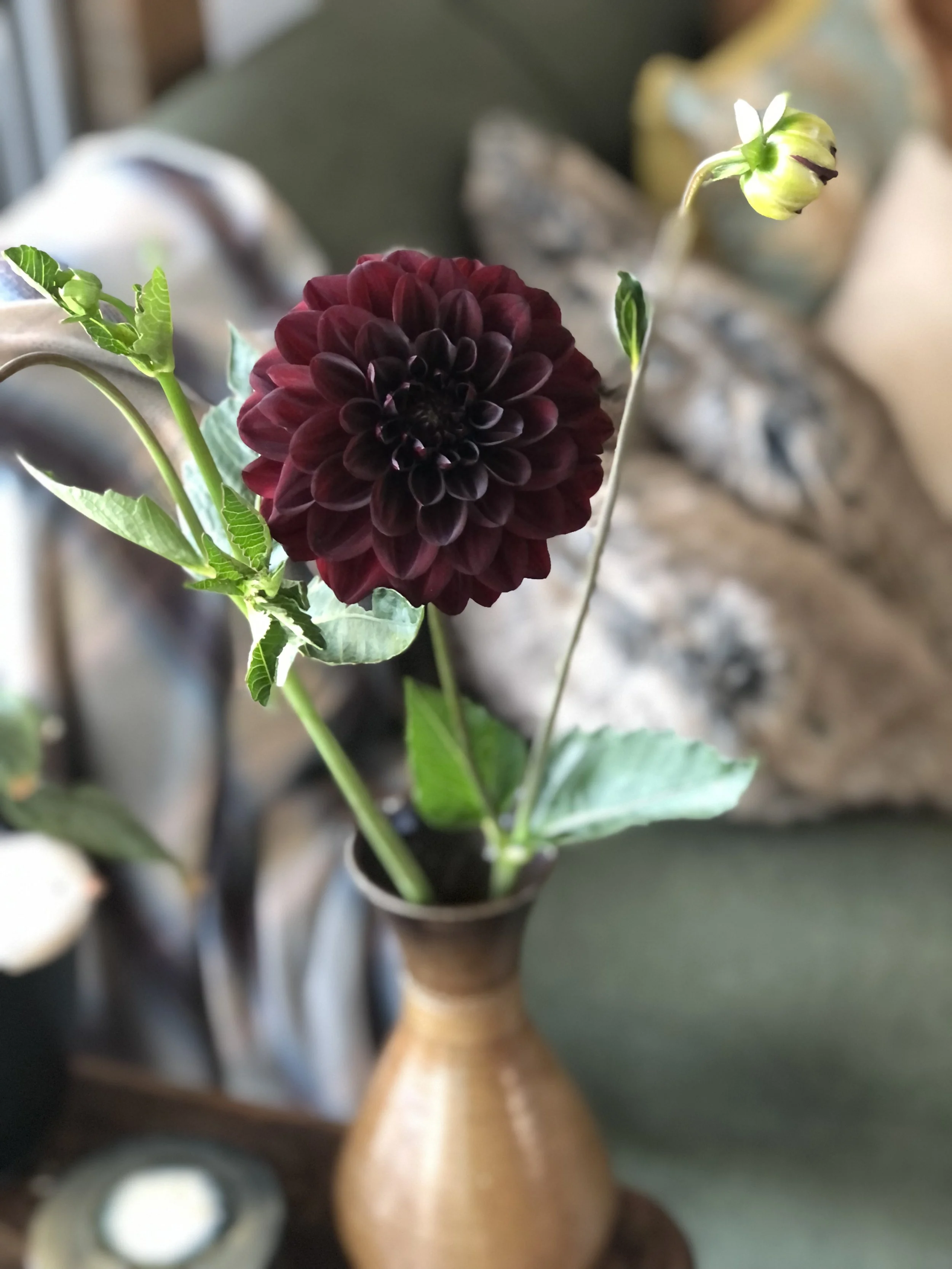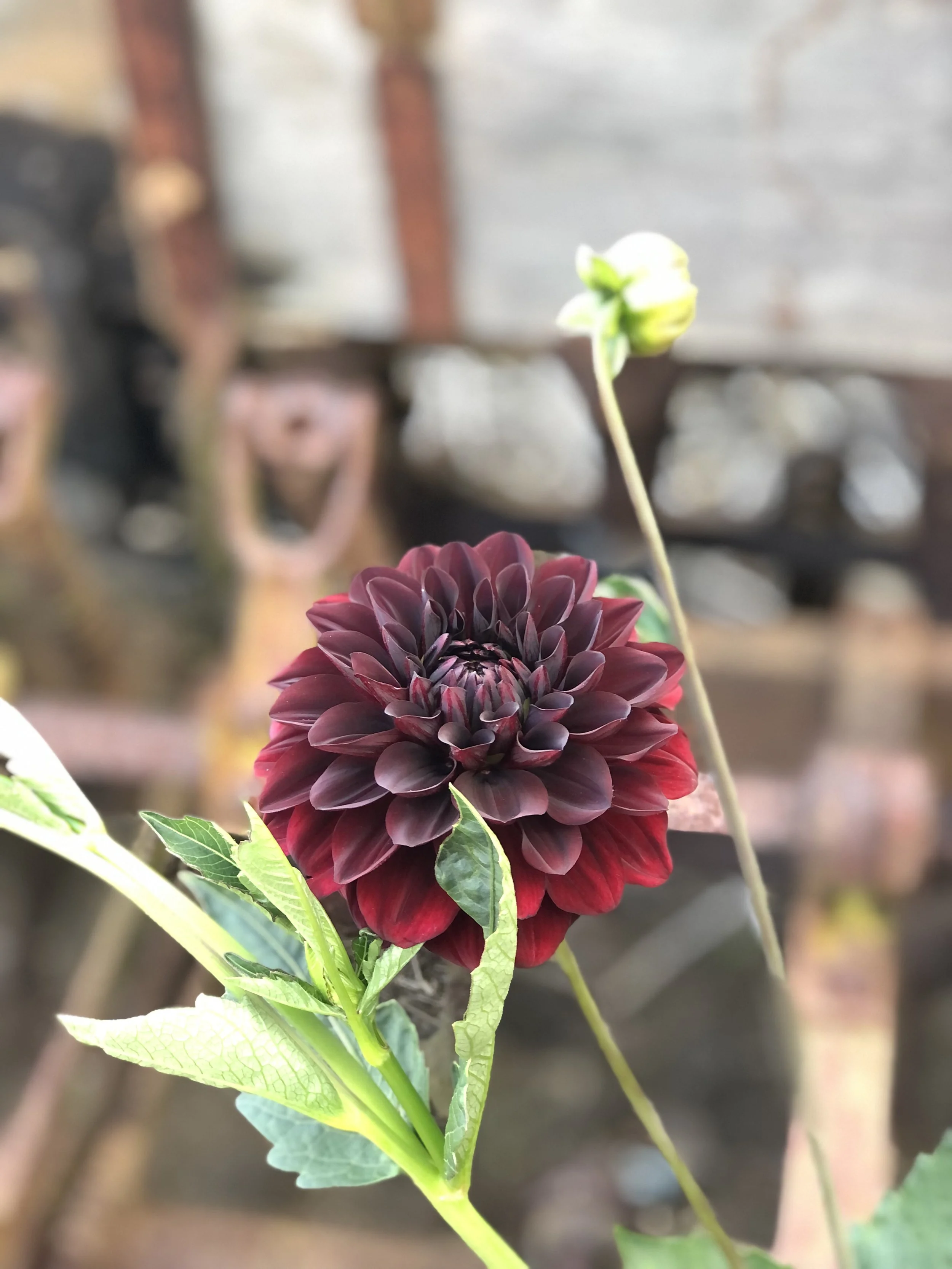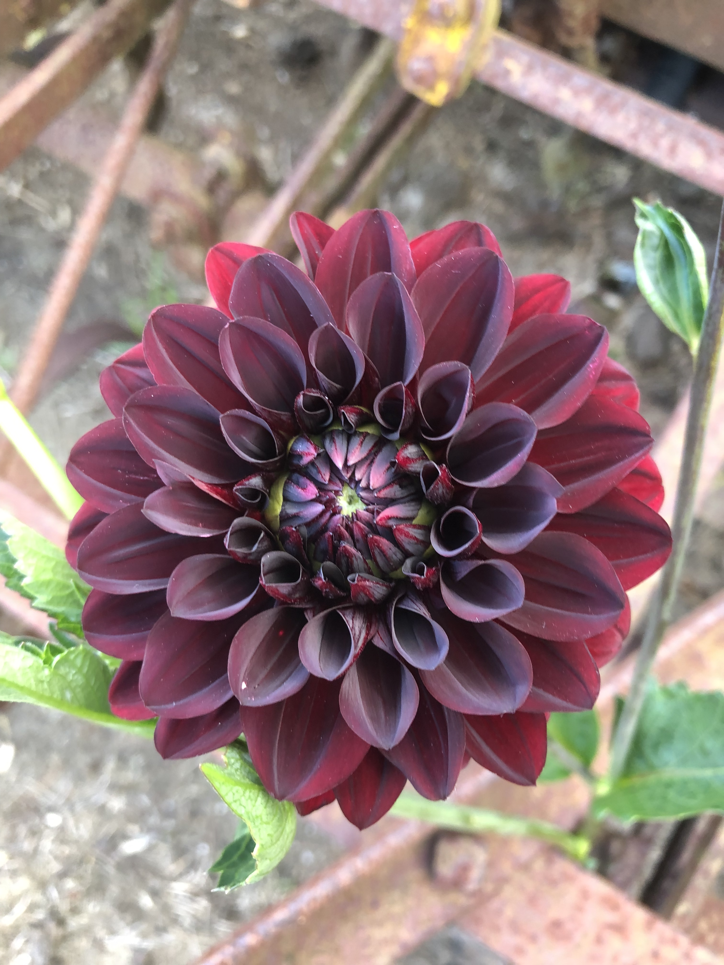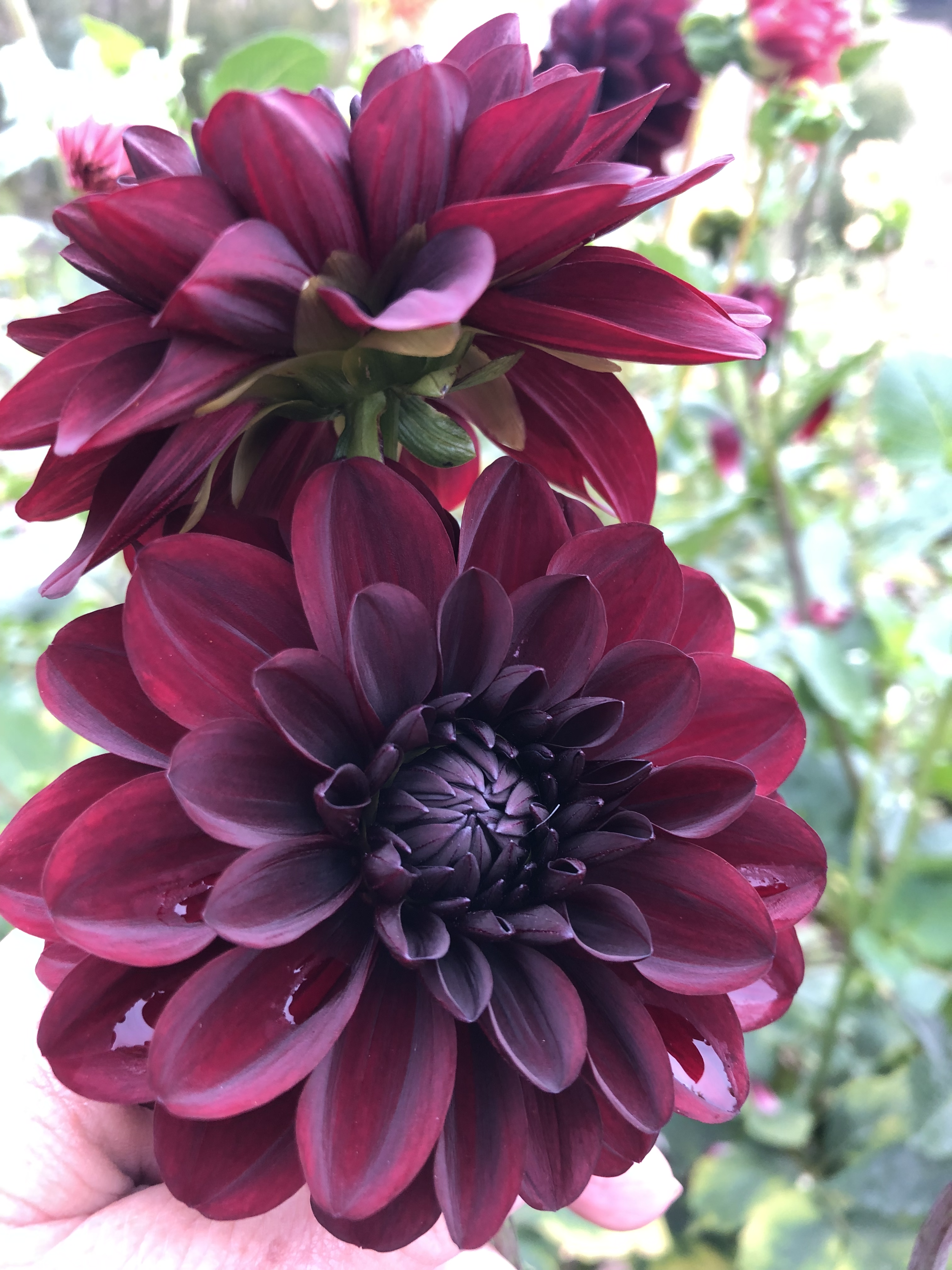 A formal decorative dahlia with rich wine tones, so deep they appear almost burgundy-black.